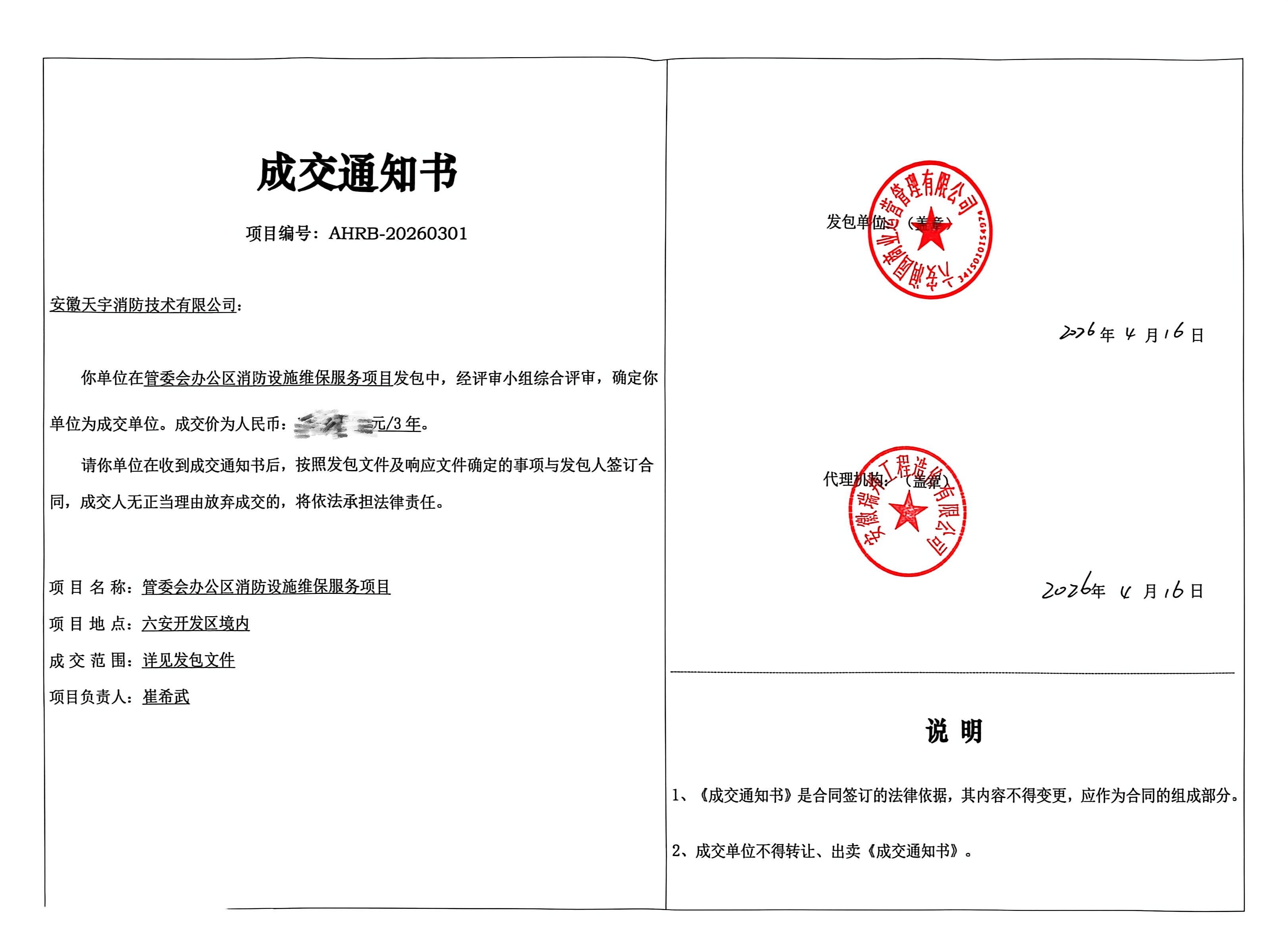 近日,安徽天宇消防技术有限公司收到由六安润园商业运营管理有限公司、安徽瑞邦工程咨询有限公司联合发出的《成交通知书》,正式确认我司为管委会办公区消防设施维保服务项目的成交单位,服务周期为3年。